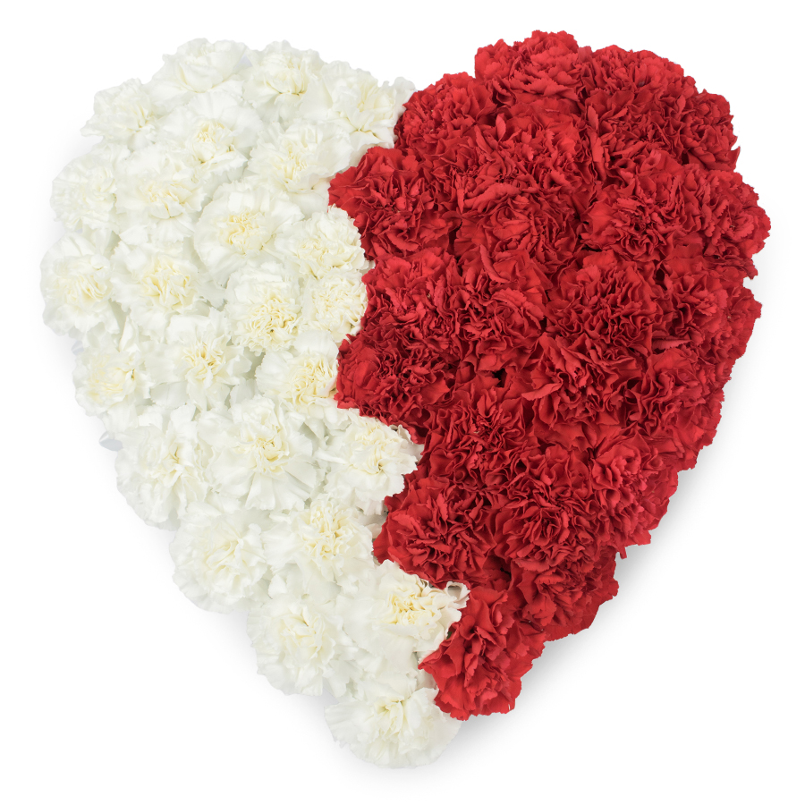 Introducing our beautifully unique heart-shaped bouquet, adorned with a vibrant mix of white and red carnations. Each flower is hand-selected to guarantee freshness and superior quality.